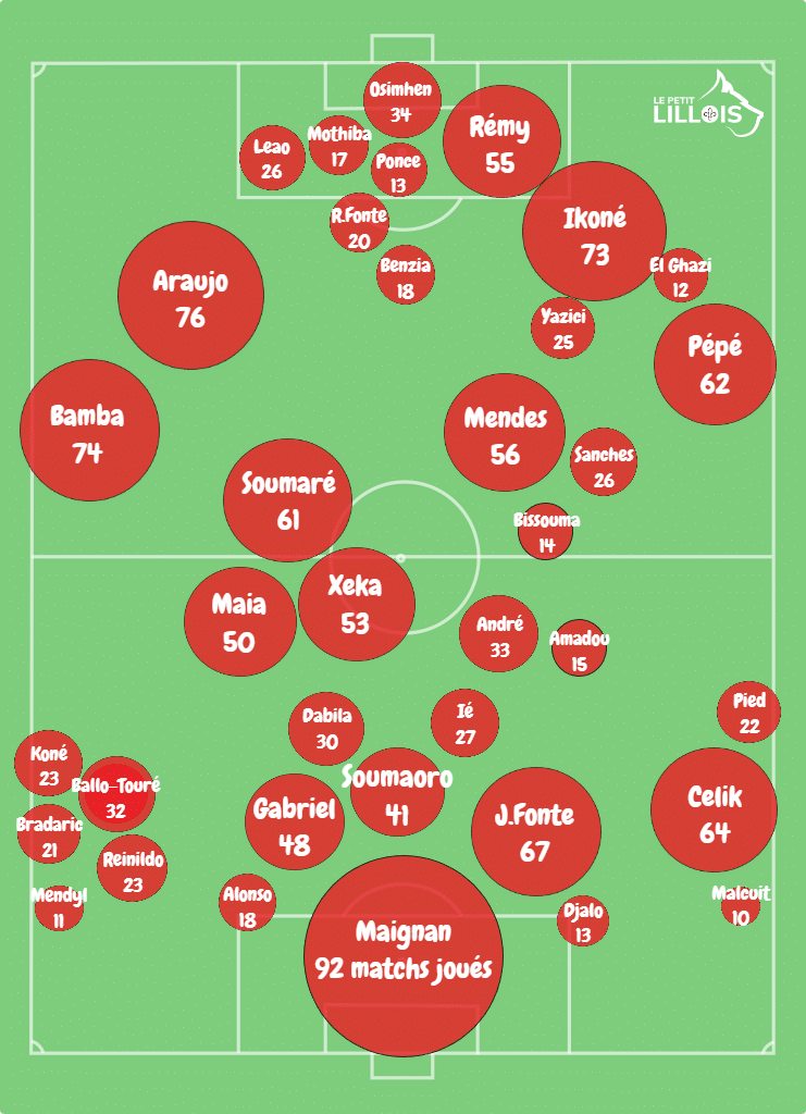 Du côté des joueurs, Christophe Galtier a utilisé 47 joueurs depuis son arrivée à Lille. Voici une infographie avec tous les joueurs qui ont joué plus de 10 matchs sous les ordres du coach lillois.