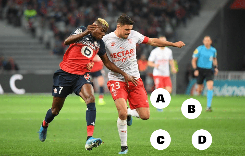 Retrouvez la bonne place du ballon dans cette image : A, B, C ou D ?