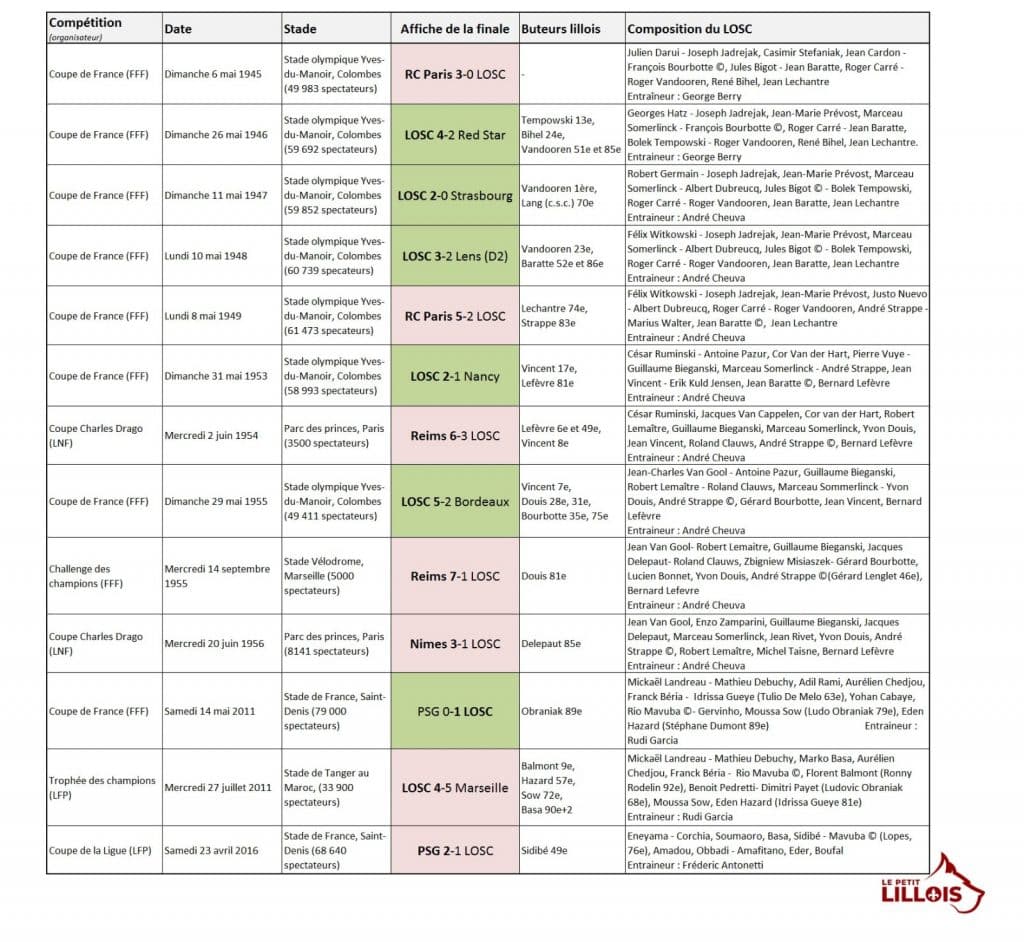 Pour fêter les 9 ans de la dernière finale de Coupe de France du LOSC, Le Petit Lillois a tenté de vous lister l’ensemble des finales disputées par l’équipe première du club.