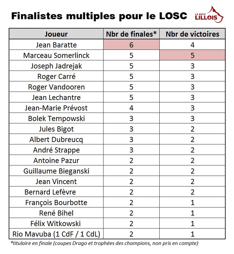 En dix saisons, les Dogues auront donc disputé la bagatelle de sept finales à Colombes. Ceci nous permet de dresser le listing des joueurs ayant disputé le plus de finale sous le maillot lillois. C’est Jean Baratte qui fut le plus souvent titularisé en finale (6 fois), même si Marceau Somerlinck compte un trophée de plus que son coéquipier (affichant un 100%, avec 5 titres en 5 finales disputées). En tout, près d’une vingtaine de joueurs, disputeront au moins deux finales de Coupe de France avec les Dogues.
