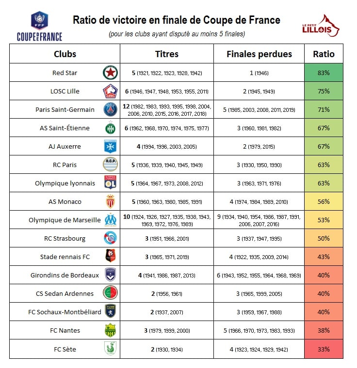 En ce qui concerne l’équipe masculine du LOSC, donc d’après 1944. Celle-ci affiche un excellent ratio de 75% de victoires en finale (6 remportées sur 8 disputées). Il s’agit là du deuxième meilleur ratio national à ce stade de la compétition. En effet, parmi les équipes qui ont disputé un minimum de cinq finales dans la compétition, seul le Red Star fait mieux que les Dogues, avec 83% de victoires (5 titres en 6 finales). La seule défaite des Audoniens à ce stade de la compétition a justement eu lieu contre… le LOSC en 1946 !