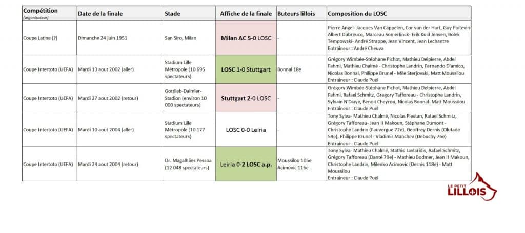 Par deux fois au début des années 2000, le LOSC se hisse en finale de la Coupe Intertoto. Il s’agit d’une compétition qui consacre en réalité trois vainqueurs par saison entre 1996 et 2005, et s’apparente donc d’avantage à une série de tours préliminaires permettant d’accéder à la Coupe UEFA.