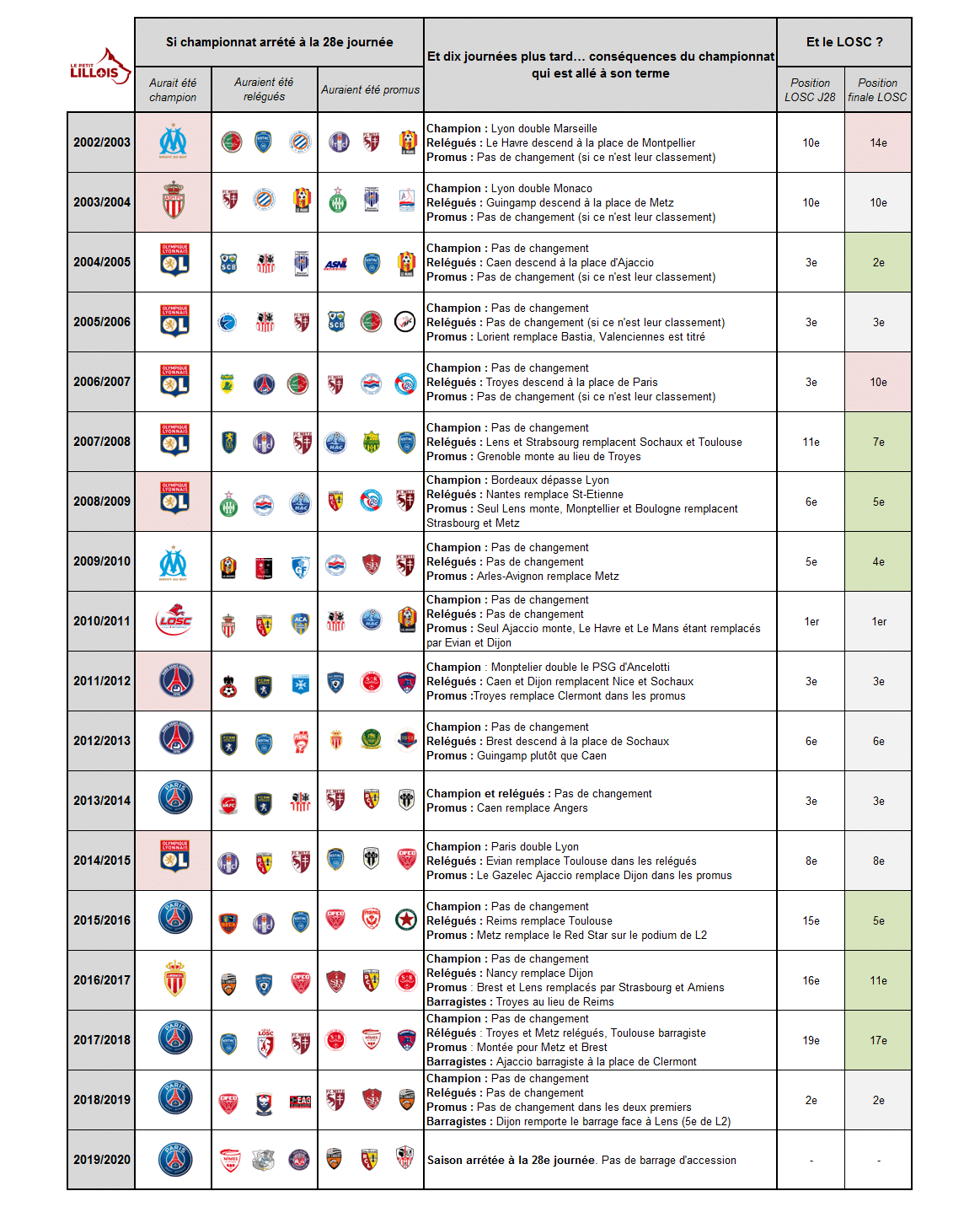 Pour la première fois de l’histoire du football, la Ligue 1 s’est terminée à l’issue de la 28ème journée. Face à cette mesure, contestée par de nombreux présidents dont Jean-Michel Aulas, Le Petit Lillois s’est penché sur les classements au soir de la 28ème journée de la Ligue 1 depuis 2002. A quoi ressemblerait la Ligue 1 si ce phénomène s’était produit avant ?
