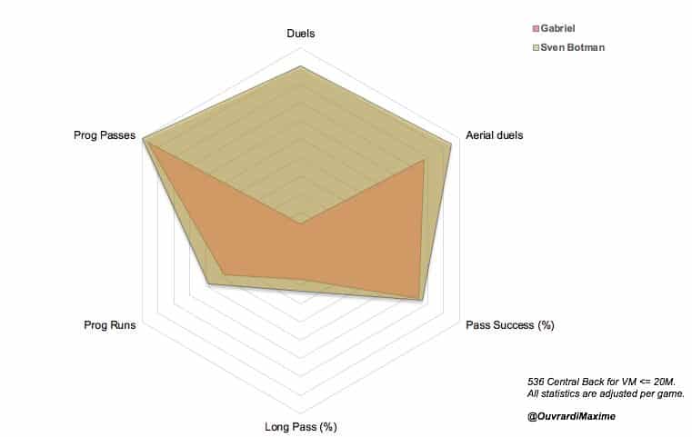 Comparaison statistiques par match entre Botman (marron) et Gabriel (orange) – via @OuvrardiMaxime