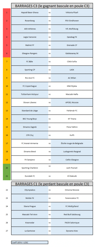 - 6 confrontations vont conduire à la qualification d’un club mieux classé que Lille au ranking UEFA (indiquées en rouge)