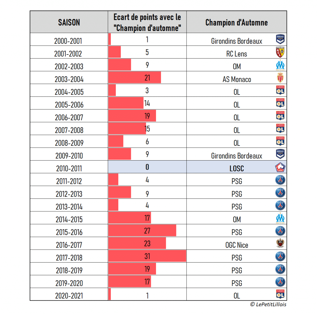 Sur la période, les Dogues ne furent « Champions d’automne » qu’une seule fois (en décembre 2010). Avec 35 points, les coéquipiers de Rio Mavuba comptaient alors 4 unités d’avance sur leurs poursuivants. Mais sur le reste des saisons du XXIème, les écarts inférieurs à 5 points entre Lille et le « Champion d’automne » sont rares :