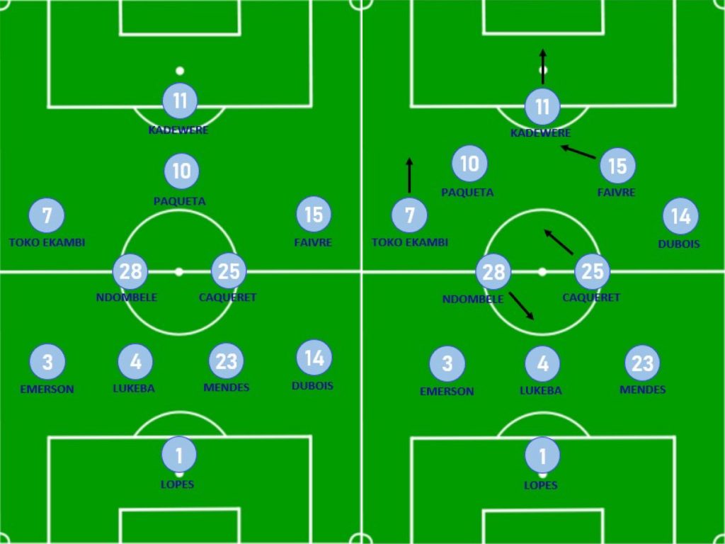 Après un passage au 3-4-1-2 qui a duré plus de deux mois, Lyon a retrouvé contre Nice son 4-2-3-1, conditionné par le départ de son numéro 6 Bruno Guimaraes et l’arrivée de Tanguy Ndombele au milieu. L’OL évolue dans ce système depuis la victoire contre Nice avec Lucas Paqueta en électron libre et l’étonnant replacement de Thiago Mendes en défense centrale aux côtés du talent lyonnais, Castello Lukeba. Le jeune défenseur central avait d’ailleurs été rayonnant pendant le match aller à Lille, en décembre dernier. En situation offensive, l’un des deux latéraux prend son couloir tandis que l’autre reste en retrait à la relance. Karl Toko-Ekambi et Léo Dubois sont plus fréquemment les deux joueurs excentrés dans le système lyonnais, ce qui permet à la nouvelle recrue, Romain Faivre, de disposer d’une position plus axiale. Au milieu de terrain, Maxence Caqueret et Tanguy Ndombele ont été très vite performants ensemble. Le premier joueur cité a dernièrement retrouvé son influence dans l’entrejeu lyonnais aux côtés de la nouvelle recrue des Gones, en grande forme pour son retour dans le Rhône. Dans ce même secteur de jeu, Houssem Aouar a perdu sa place dans le onze de l’OL.