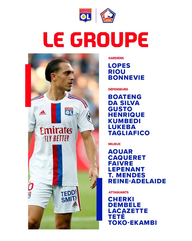 L’affiche de la 13ème journée de Ligue 1 Uber Eats opposera le LOSC à l’OL. Pour cette rencontre, Laurent Blanc devra se passer de deux joueurs comme prévu, il s’agit de Sinaly Diomandé (suspendu) et Corentin Tolisso (blessé). Le jeune Bradley Barcola ne figure également pas dans le groupe, suite à un choix de l’entraîneur.
