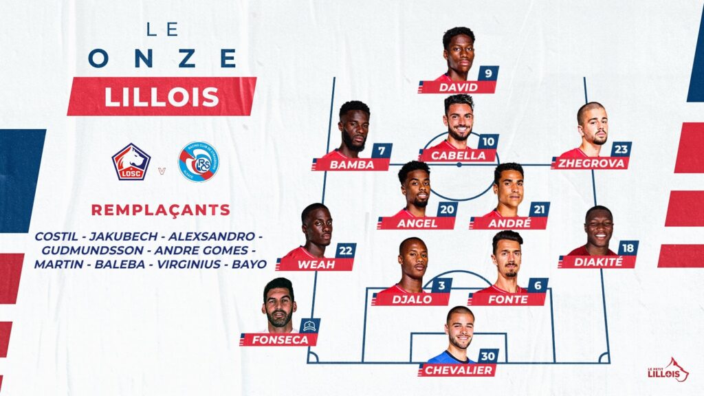 Paulo Fonseca a dévoilé son onze de départ pour la rencontre LOSC Lille – RC Strasbourg Alsace, prévue ce dimanche 12 février à 15 heures au Stade Pierre Mauroy et diffusée sur Prime Vidéo.