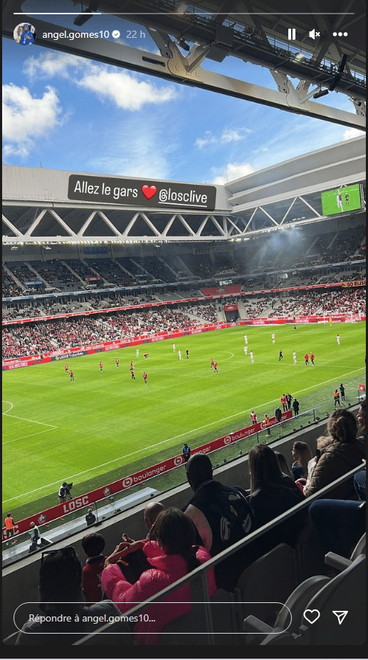 Suspendu à la suite d’une accumulation de cartons jaunes, Angel Gomes était tout de même présent dans les tribunes de la Decathlon Arena pour soutenir ses coéquipiers. Le milieu de terrain lillois a posté une photo dans les travées du stade lors du coup d’envoi accompagnée du message « Allez les gars »
