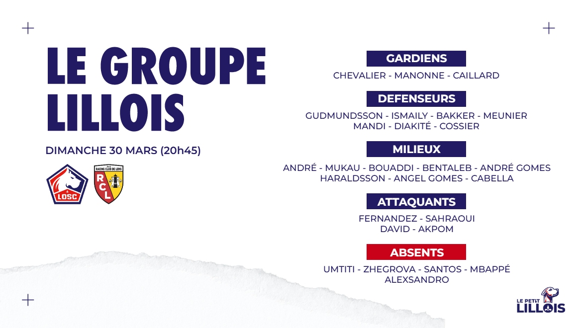 Les absents : Samuel Umtiti, Tiago Santos, Edon Zhegrova, Ethan Mbappé (blessés), Alexsandro (suspendu)