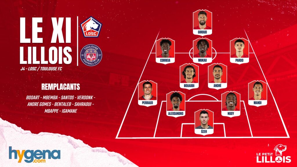 LOSC : Özer – Mandi, Ngoy, Alexsandro, Perraud – Bouaddi, André – Correia, Mukau, Fernandez-Pardo – Giroud