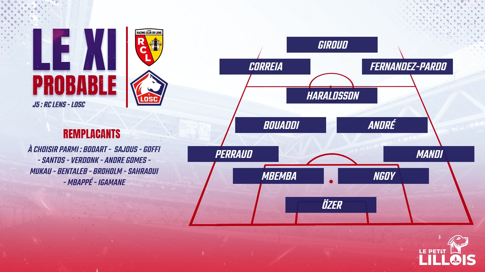 L’incertitude du week-end concerne Benjamin André. Titulaire dans l’esprit de tous (sans exception), sa pugnacité est un exemple, il est malgré tout, selon nos informations, gêné sur le plan musculaire. Son cas sera définitivement tranché dans la soirée. Il pourrait de nouveau être aligné aux côtés d’Ayyoub Bouaddi, avec lequel il forme un duo séduisant en ce début de saison. Ce double pivot pourrait retrouver Hakon Haraldsson un cran plus haut, lui qui était absent une semaine plus tôt face au Toulouse FC. Enfin, en attaque, Olivier Giroud pourrait de nouveau être accompagné par Matias Fernandez-Pardo et Félix Correia.