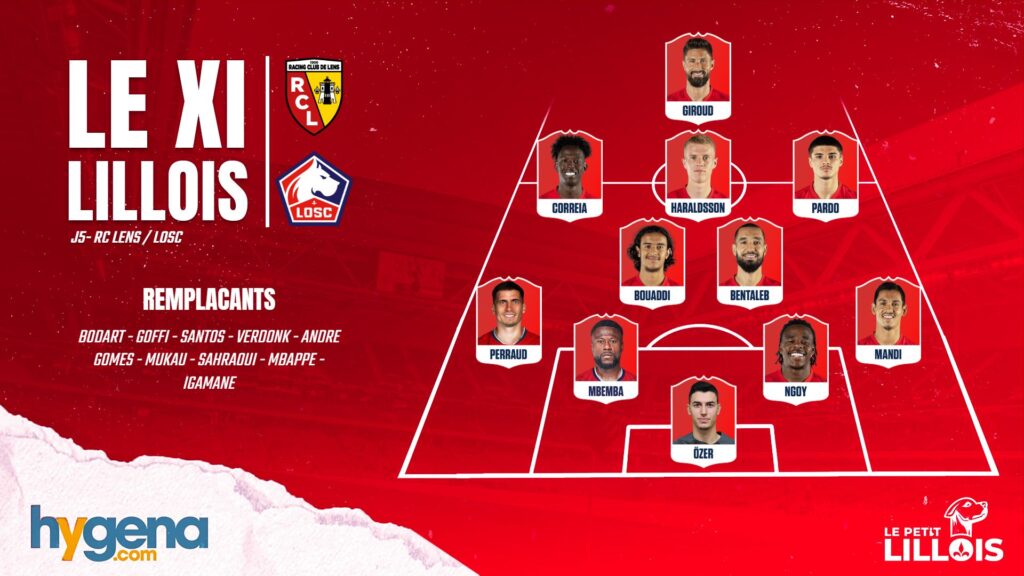 LOSC : Özer – Mandi, Ngoy, Mbemba, Perraud – Bentaleb, Bouaddi – Matias Fernandez-Pardo, Haraldsson, Correia – Giroud