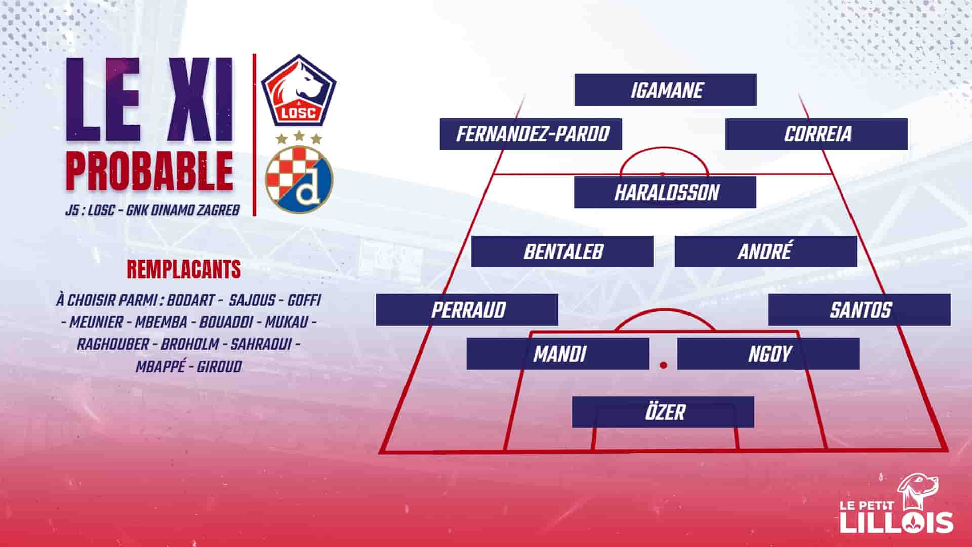 En quête de points, le LOSC pourrait ne pas trop bouleverser ses habitudes lors de son duel avec les Croates du Dinamo Zagreb. Deux changements pourraient tout de même être réalisés en défense avec les apparitions de Tiago Santos et Nathan Ngoy, aux côtés d’Aïssa Mandi et Romain Perraud, dans le onze de départ. Ce quatuor pourrait former l’assise défensive lilloise devant Berke Özer dans les cages. Au milieu de terrain, Benjamin André devrait retrouver sa place, avec la possibilité de reformer un duo avec Nabil Bentaleb, d’ailleurs apparu en conférence de presse mercredi.