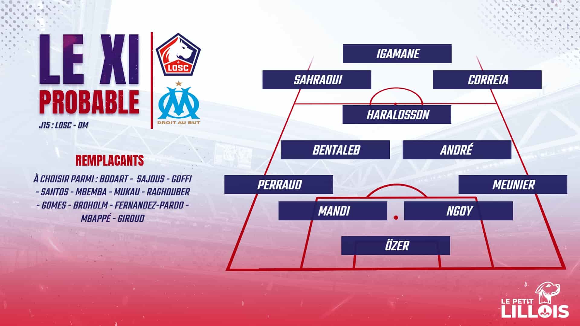 - La composition probable du LOSC (4-2-3-1) : Özer – Meunier, Ngoy, Mandi, Perraud – André, Bentaleb – Correia, Haraldsson, Sahraoui – Igamane