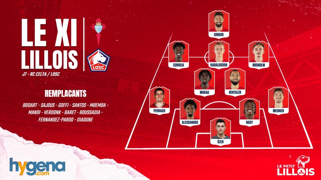 LOSC : Özer – Meunier, Ngoy, Alexsandro, Perraud – Bentaleb, Mukau – Broholm, Haraldsson, Correia – Giroud (cap.)