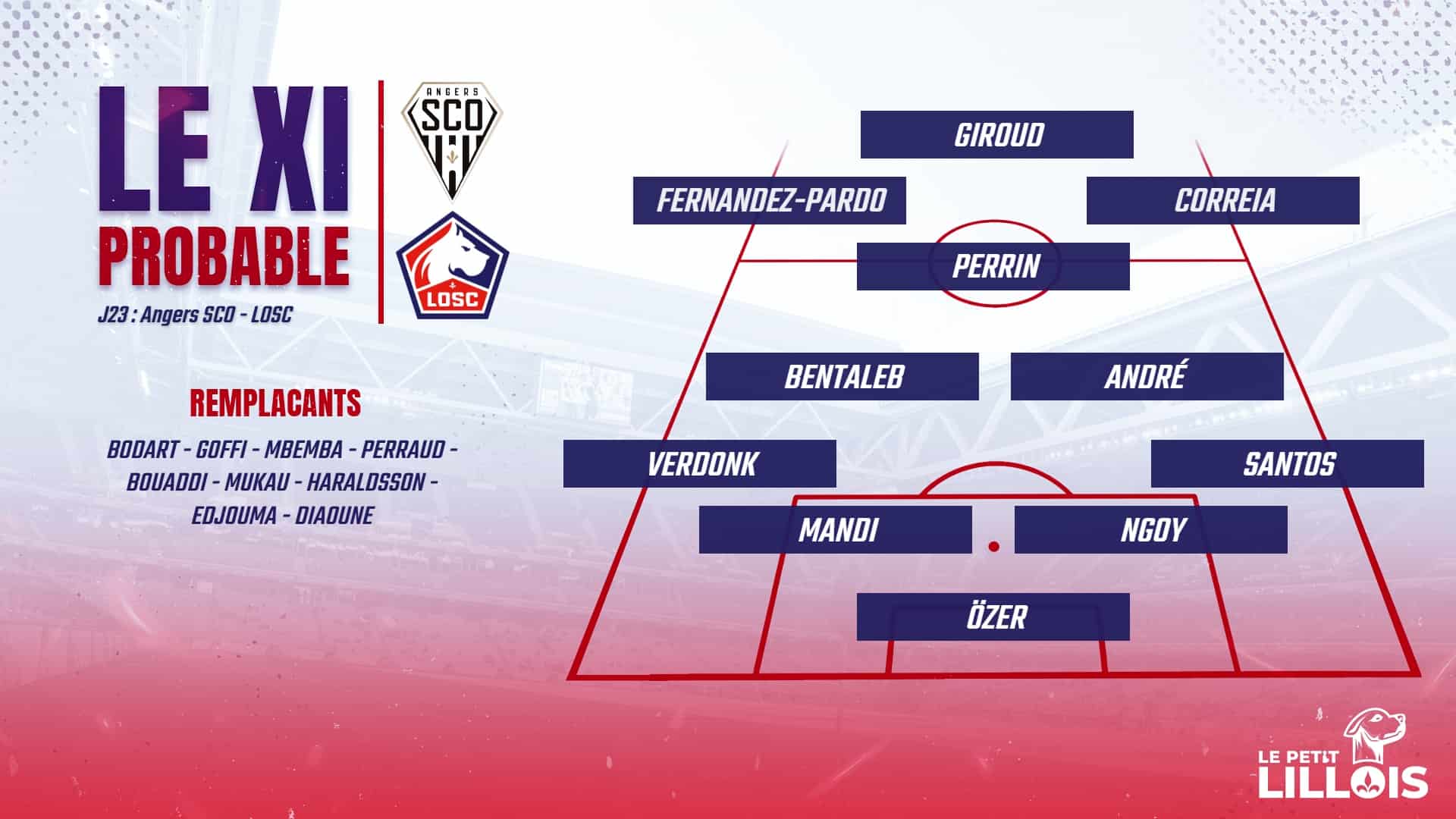 La composition probable du LOSC (4-2-3-1) : Özer – Santos, Ngoy, Mandi, Verdonk – André, Bentaleb – Correia, Perrin, Fernandez-Pardo – Giroud