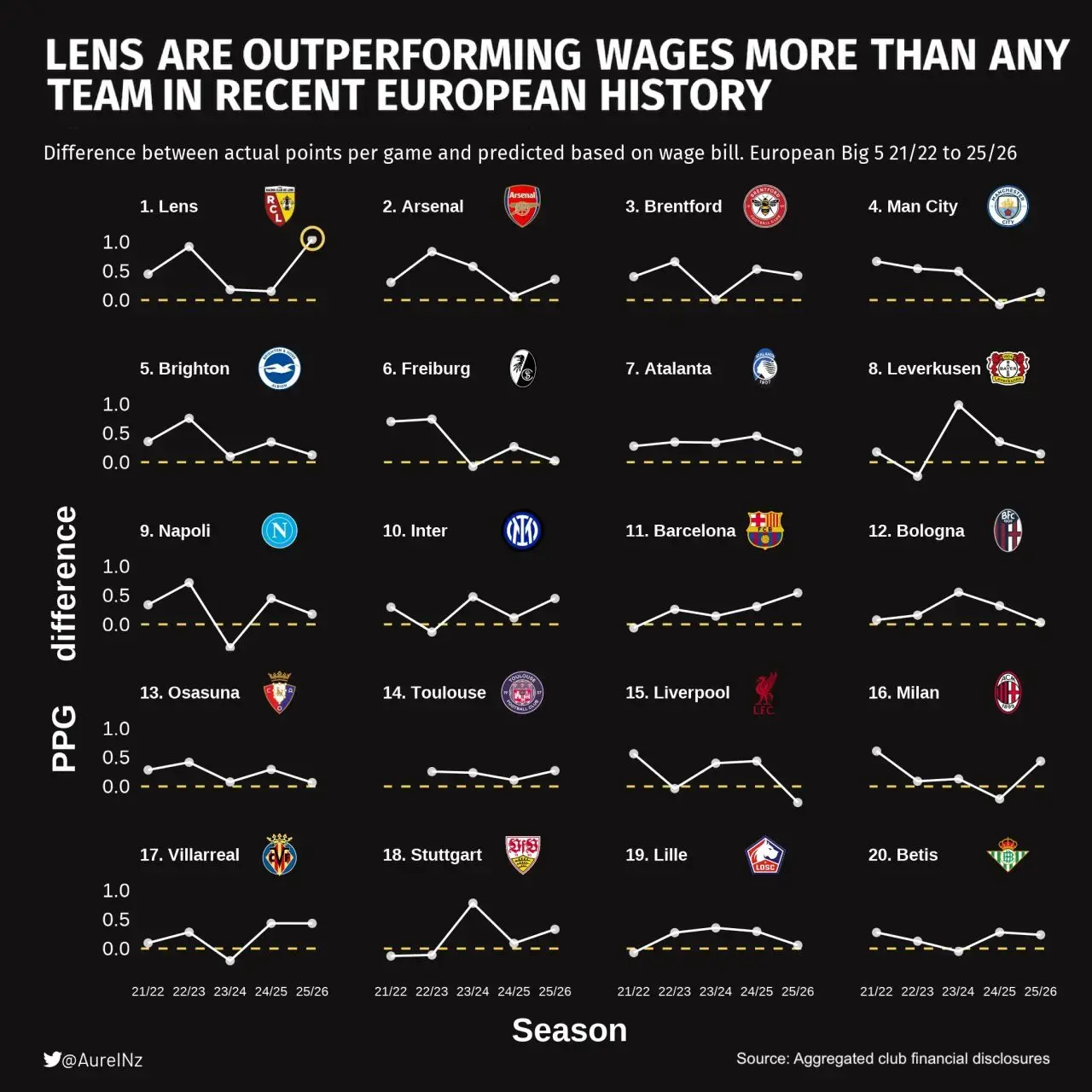 Une étude comparative entre clubs européens a tout récemment été réalisée par Aurel Nazmiu, data scientist. Celle-ci valorise les performances sportives en fonction du pourcentage des budgets alloués aux masses salariales, ce qui crée un indicateur de surperformance. Ce dernier permet de comparer ainsi les résultats obtenus à ceux qui auraient logiquement dû l’être, et ce, sur une période de cinq saisons – de 2021-2022 à 2025-2026 – pour l’ensemble des formations présentes dans les cinq grands championnats et d’en faire un classement.