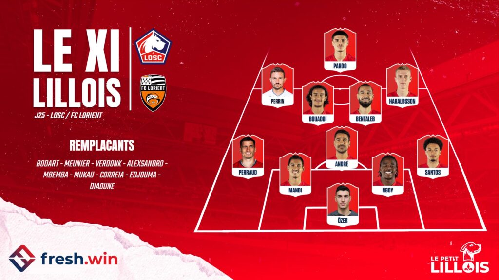 LOSC : Özer – Santos, Ngoy, Mandi, Perraud – André (cap.), Bentaleb, Bouaddi – Perrin, Fernandez-Pardo, Haraldsson